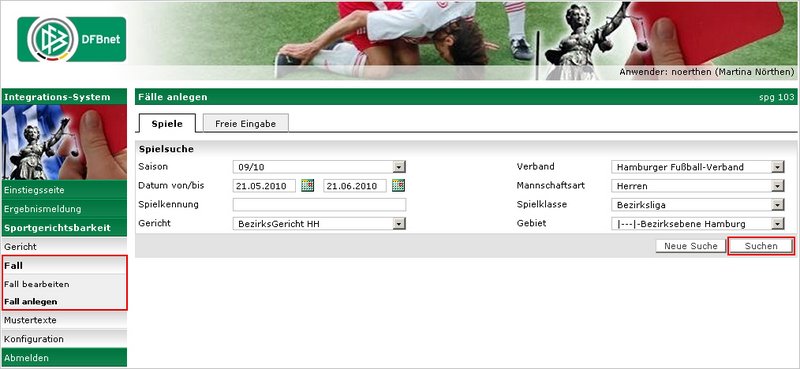 In dem ersten Modus muss nach Spielen in dem DFBnet gesucht werden. Hierbei werden Berechtigungen der Richter bzw. Staffelleiter berücksichtigt, die dem Benutzer über die Benutzerverwaltung bzgl. der Rolle Sportrichter oder Staffelleiter für die Anwendung Sportgerichtsbarkeit (in den Spielgebieten (mit Vereinen in diesen Gebieten), Mannschaftsarten und Spielklassen) gegeben wurden. In der freien Eingabe kann der Benutzer alle relevanten Daten über entsprechende Textfelder eingeben. Die Auswahl des Modus erfolgt für die Wahl des Tabs. Klickt der Benutzer auf den Menüpunkt „Fall / Fall anlegen“, werden ihm 2 Tabs – „Spiele„ und „freie Eingabe“ - angeboten. Durch Auswahl des Tabs gelangt man in den entsprechenden Modus.