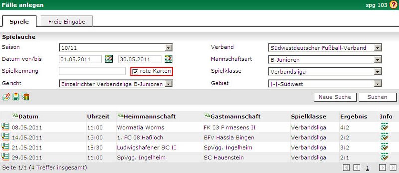 Sofern Sie den Spielbericht online in den entsprechenden Spielklassen verwenden, besteht bei einer Fallanlage die Möglichkeit, nach Spielen zu suchen, in denen mindestens eine Rote Karte erteilt wurde. Unter dem Menüpunkt „Fall anlegen“ können Sie hinter dem Feld „Spielkennung“ die Filtermöglichkeit „Rote Karte“ per Mausklick aktivieren. (siehe Screen „rote Karten“).