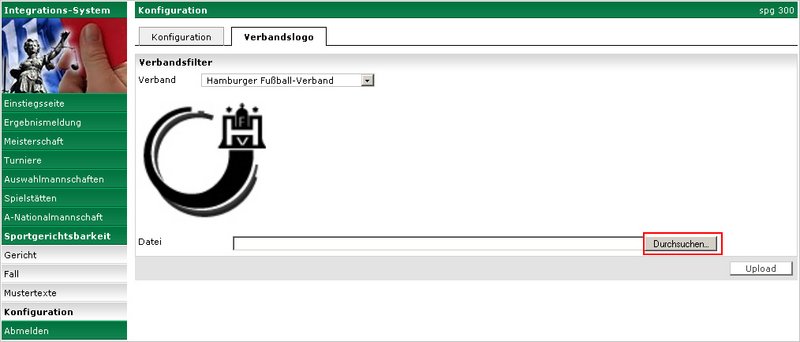 Um das Logo für Ihren Verband zu ändern, wählen Sie den Button „Durchsuchen“. Es wird Ihnen ein Dialog angeboten, in dem Sie das neue Logo suchen und auswählen können. Durch Bestätigen des Dialogs mit einem Klick auf den Button „Upload“ wird das entsprechende Logo geladen und anschließend angezeigt.