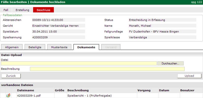 Ist der Spielbericht Online im Einsatz, wird bei der Fallanlage nach dem Spiel der Spielbericht in der aktuellen Version als Dokument im Fall gespeichert. Liegt zudem ein Sonderbericht im Spielbericht vor (Upload des Sonderberichts im Spielbericht), wird auch dieser der Elektronischen Akte hinzugefügt.