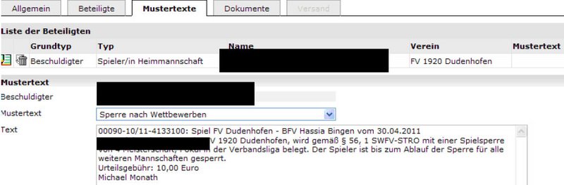 Jetzt kann der Benutzer einen Mustertext mit Schlüsselwörtern auswählen, der zuvor von dem Sportgerichtsadministrator erstellt und vorgegeben wurde. Nach Auswahl eines Textes, zeigt das System in dem Mustertextbereich den entsprechenden Text an. Automatisch werden in dem Mustertext die Schlüsselwörter durch die mit ihnen verbundenen Daten aus dem Tab „Beteiligte“ ersetzt und angezeigt.