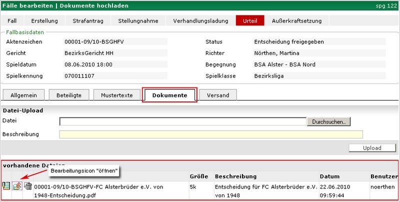 Die Sportgerichtsbarkeit soll den Benutzern helfen Dokumente zu erstellten, um mit dem Verein bzw. den Beschuldigten oder auch Zeugen kommunizieren zu können. Dazu bietet das System die Möglichkeit für alle entsprechenden Vorgänge mit Hilfe von Mustertexten Dokumente zu generieren. Es werden PDF-Dateien generiert. Der Benutzer kann aber auch Dokumente zu den einzelnen Vorgängen hochladen.