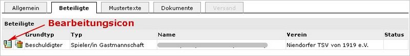 Sind mehrere Beteiligte / Beschuldigte zu einem Fall zugeordnet, blendet das System automatisch die Daten des ersten Beschuldigten / Beteiligten vor. Der Benutzer kann nun die relevanten Daten für diesen Vorgang eingeben. In diesem Fall kann er die Gesetzesgrundlagen, Sanktionen sowie Spielersperren erfassen. Durch Betätigen des Buttons „Speichern“ werden die Daten gesichert. Um die Daten für den nächsten Beteiligten eingeben zu können, drückt der Benutzer das Bearbeitungsicon "vor dem nächsten Beschuldigten". Anschließend können die Daten für den nächsten Beteiligten für diesen Fall eingegeben und gespeichert werden.
